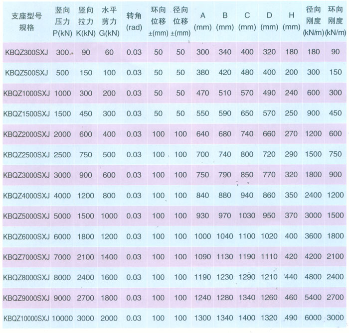 KBQZ-SXJ雙向位移減震型球形支座參數(shù)表 表10