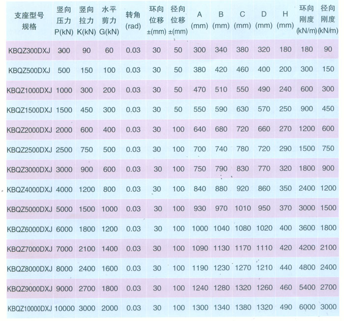 KBQZ-DXJ單向位移減震型球型支座參數(shù)表 表1 1